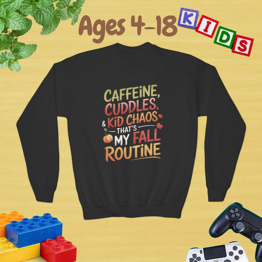 Caffeine, Cuddles, & Kid Chaos That is My Fall Routine Fun Unisex Ages 4-18 Kids Teens Sweatshirt - Cozy Fall Winter Youth Sweatshirt