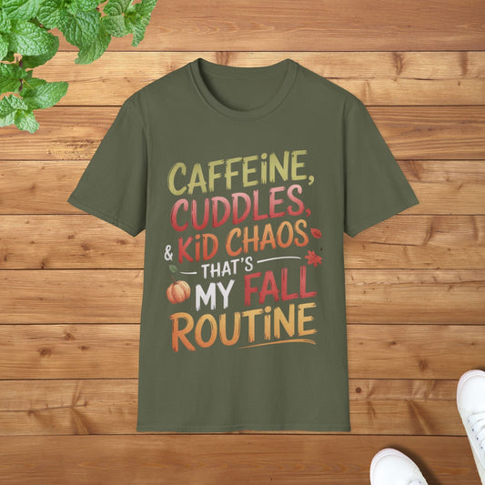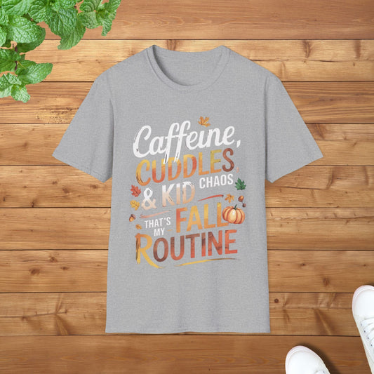 Caffeine, Cuddles & Kid Chaos - That is My Fall Routine Chill Unisex Adult T-Shirt - Soft Fall Parent Apparel