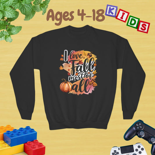 I Love Fall Most of All Ages 4-18 Unisex Kids and Teens Sweatshirt - Cozy Fall and Winter Youth Sweatshirt