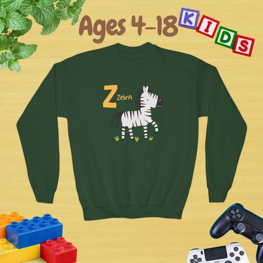 Animal Alphabet Z for Zebra Ages 4-18 Unisex Kids and Teens Sweatshirt - Cozy Fall and Winter Youth Sweatshirt