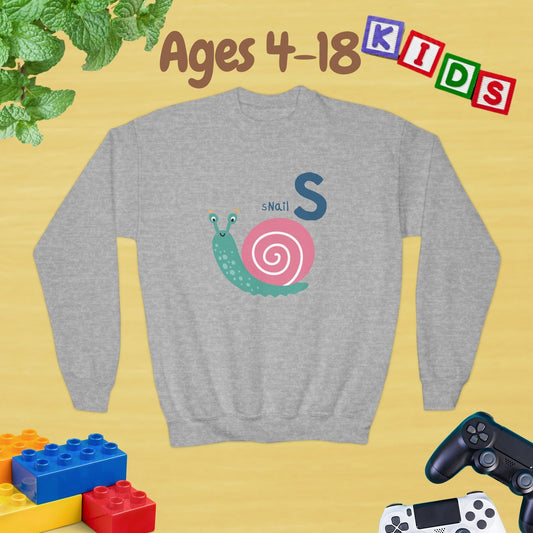 Animal Alphabet S for Snail Ages 4-18 Unisex Kids and Teens Sweatshirt - Cozy Fall and Winter Youth Sweatshirt