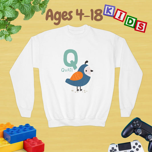 Animal Alphabet Q for Quail Ages 4-18 Unisex Kids and Teens Sweatshirt - Cozy Fall and Winter Youth Sweatshirt