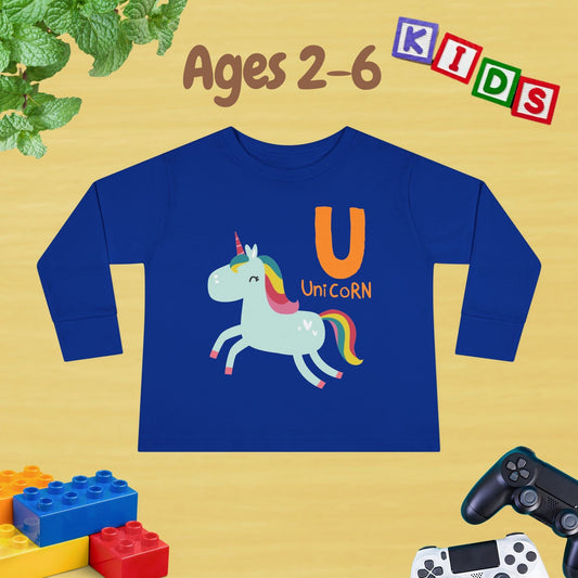 Animal Alphabet U for Unicorn Unisex Kids Sweater Toddler Long Sleeve Tee Ages 2-6 - 100% Cotton Spring and Fall Kids Sweatshirt