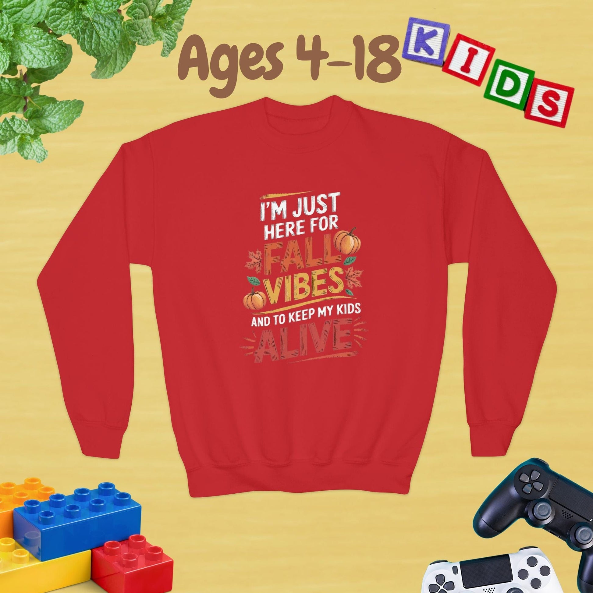 I am Just Here for the Fall Vibes & to Keep My Kids Alive Fun Unisex Ages 4-18 Kids Teens Sweatshirt - Cozy Fall and Winter Youth Sweatshirt